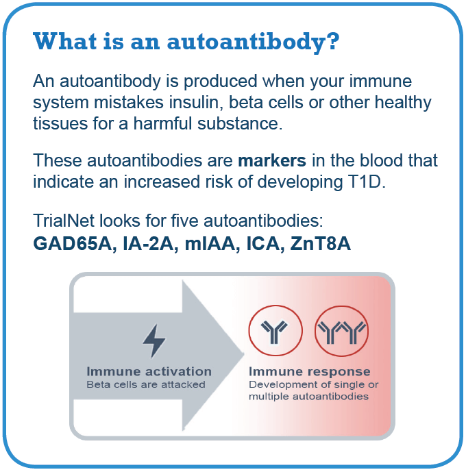 How can we predict which family members will progress to diabetes? T1D occurs when the immune system mistakenly attacks and destroys the insulin-producing beta cells in the body. With TrialNet risk screening, a simple blood test can detect diabetes-related autoantibodies, markers that signify an autoimmune attack.